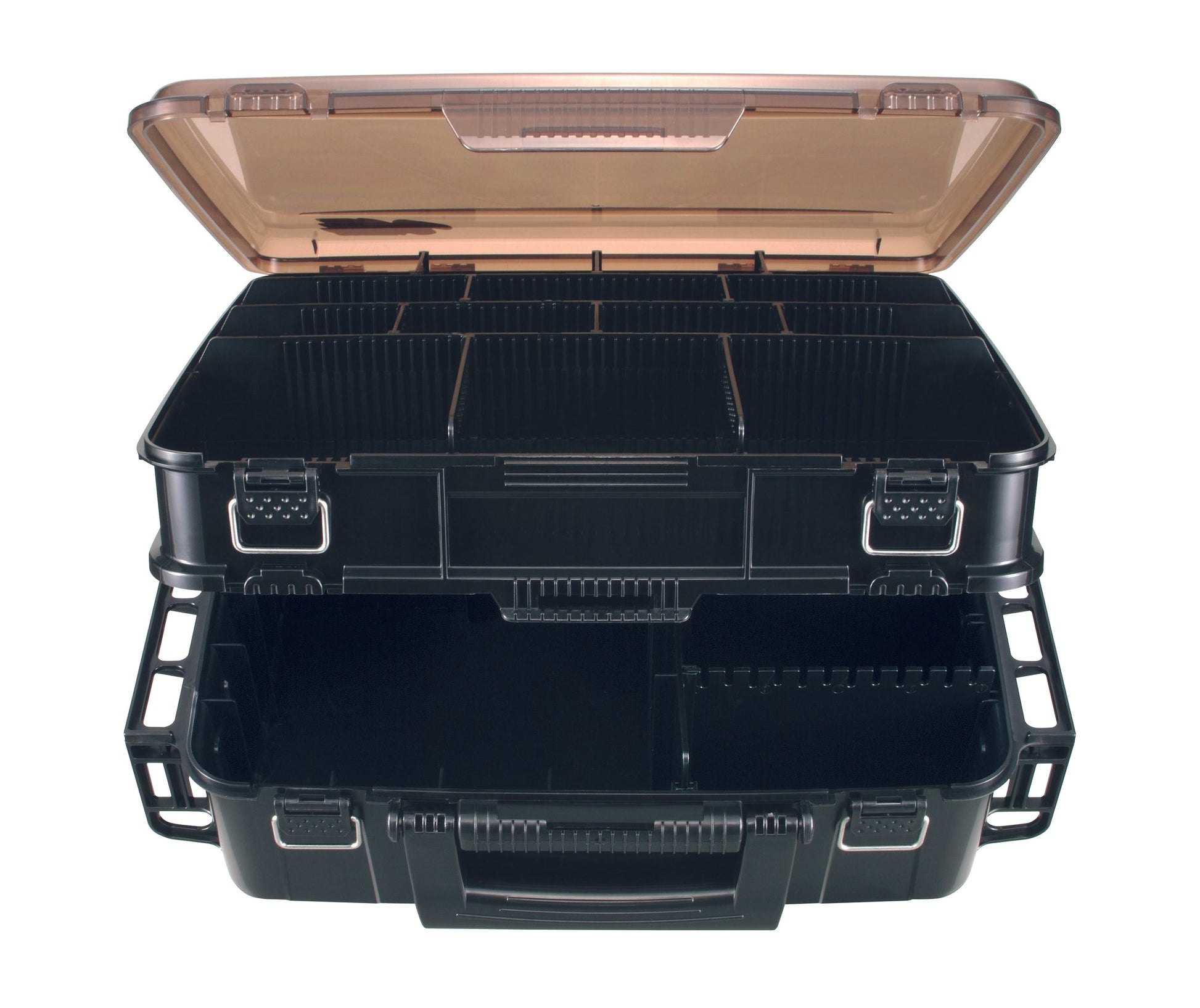 Der Versus 3080 ist das Flaggschiff von MEIHO und einer der praktikabelsten Gerätekästen überhaupt. Durch das Top-Cover aus transparentem Polycarbonat frei einsehbar auf die völlig individuell gestaltbare Einteilung. Im äußerst geräumigen Bodenfach, welches wiederum frei einteilbar ist, finden auch größere Artikel wie z.B. Angelrollen Platz. Der MEIHO Versus VS 3080 besitzt eine spezielle Sicherung gegen ungewolltes Öffnen selbst bei offenen Scharnieren.