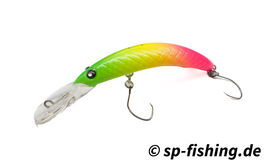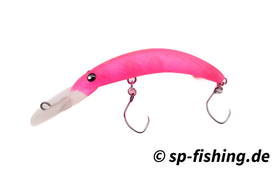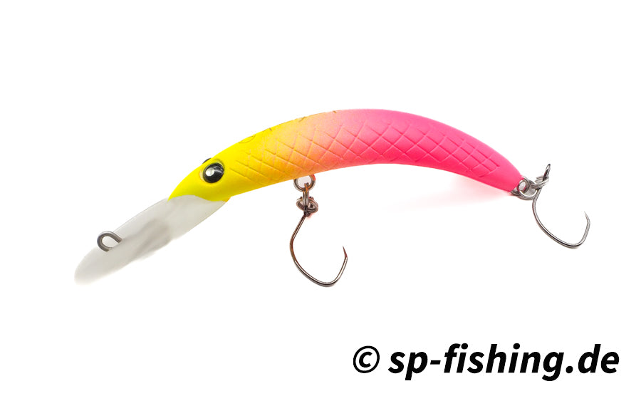 Der Körper hat einen leichten Schuppeneffekt. Ein schwimmender Wobbler zum Fangen von Teichforellen. Es hat einen hohen Auftrieb. Aufgrund ihrer Größe und Form hat sie ein schwungvolles Spiel, das selbst die vorsichtigsten Forellen in den Wahnsinn treibt. Der nach unten verlagerte Schwerpunkt sorgt dafür, dass der Köder sein einzigartiges Spiel auch bei den langsamsten Führungen beibehält.