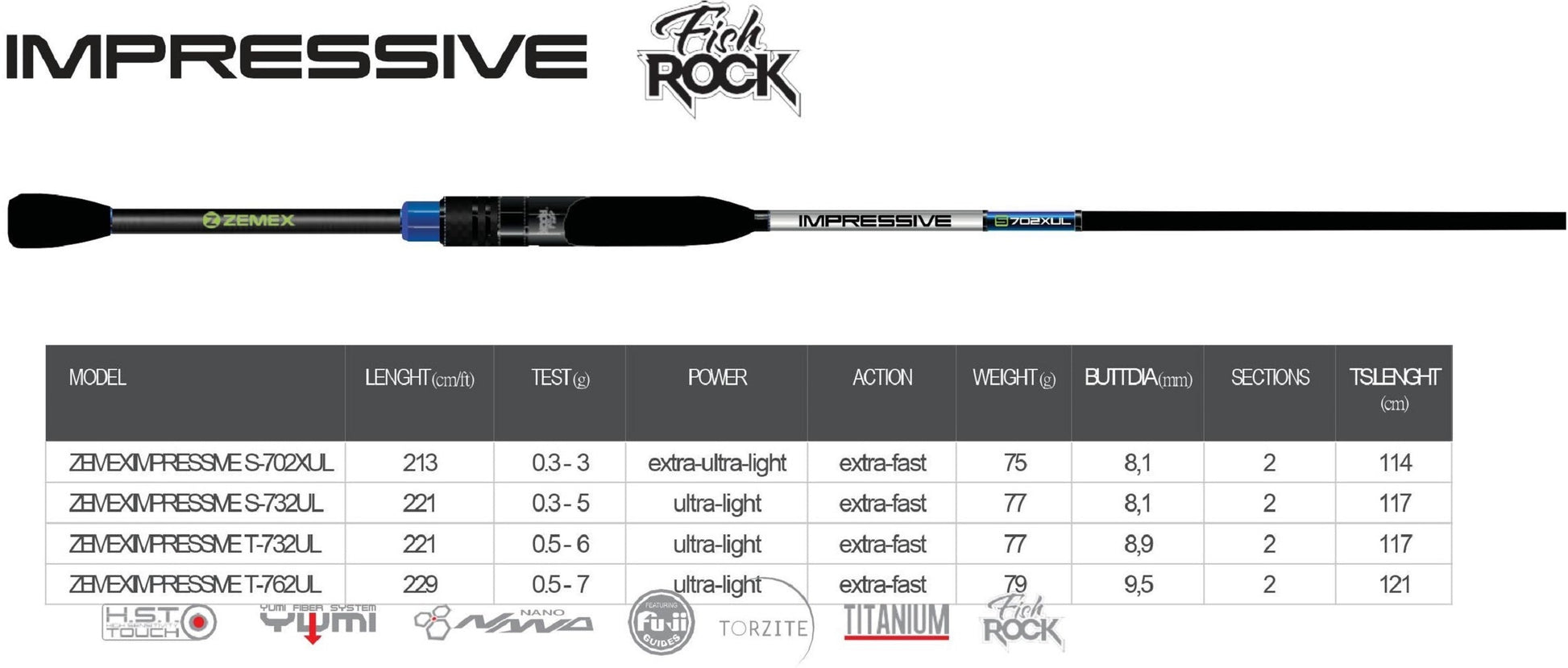 ZEMEX Impressive - Die aktualisierte Serie ZEMEX Impressive Rockfish ist eine hochwertige Spinnrute für Sportangler und Fans des ultraleichten Jig-Fischens mit erhöhtem Komfort. Sie sind sehr leicht, haben erstaunliche Resonanzeigenschaften und ausgezeichnete Gusseigenschaften. Die ZEMEX Impressive Rock-Fischserie erfüllt die höchsten Anforderungen von Sportlern bei der Auswahl eines Sportinstruments.